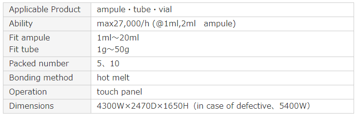 Proposal of ampule test packing line. Able to suggest one line including a cartoner of the next process from an inspection machine for a foreign substance.