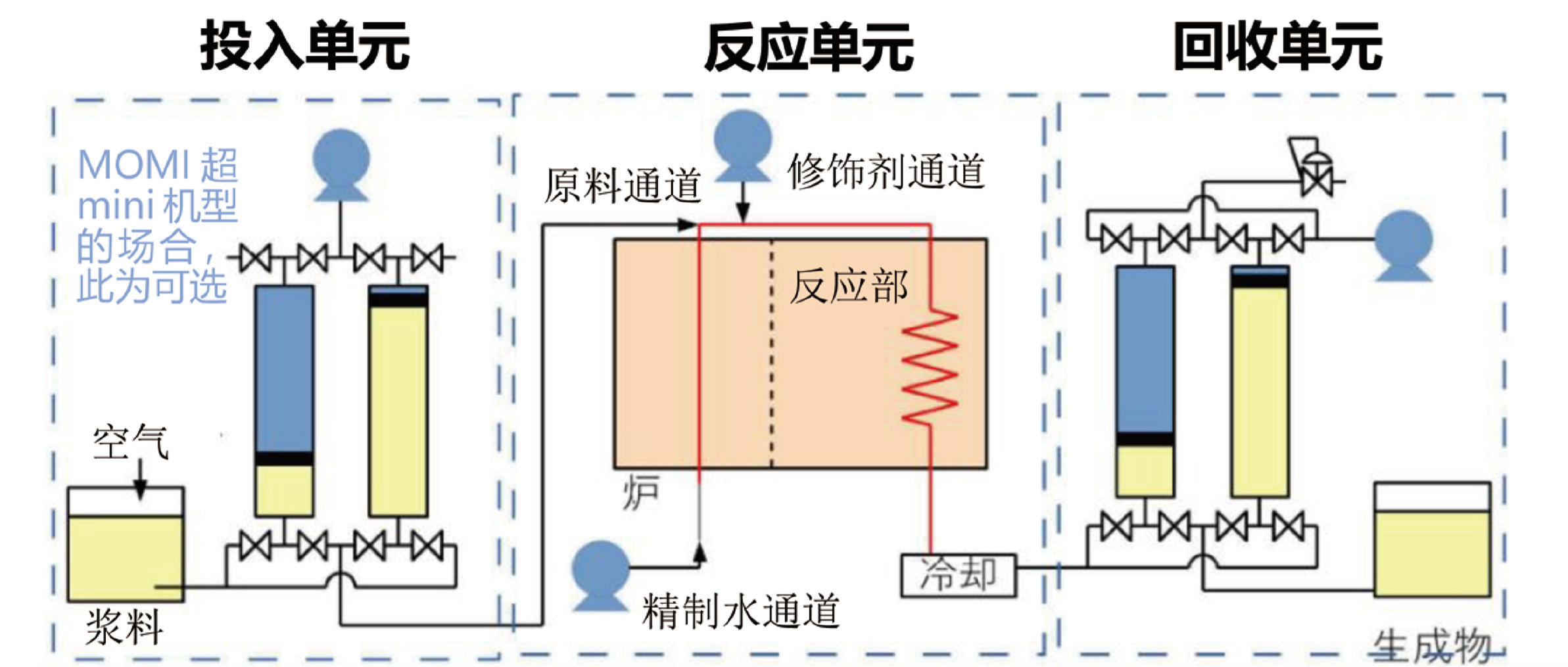 通過流通方式進(jìn)行超臨界水處理的裝置。 超臨界水指的是:在溫度374°c,壓力22.lMPa以上狀態(tài)的水兼具液體和 氣體特質(zhì)的狀態(tài)。本裝置為流通式,連續(xù)進(jìn)行原料處理,比起批量式節(jié)約時(shí)間。粒子送液·回收通過氣缸系統(tǒng)。